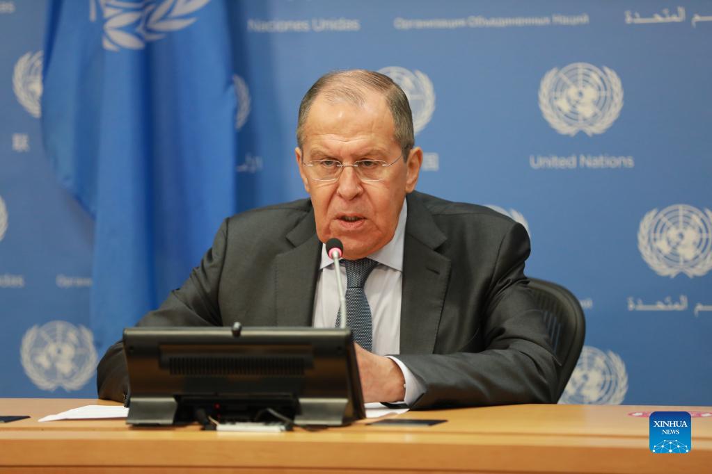 O ministro das Relações Exteriores russo, Sergei Lavrov, participa de uma coletiva de imprensa na sede da ONU em Nova York, no dia 25 de setembro de 2021. É impossível alcançar o processo político no Afeganistão sem a cooperação do Talibã, disse o ministro das Relações Exteriores russo, Sergei Lavrov, no sábado, em uma coletiva de imprensa na sede da ONU em Nova York. (Xinhua/Xie E)