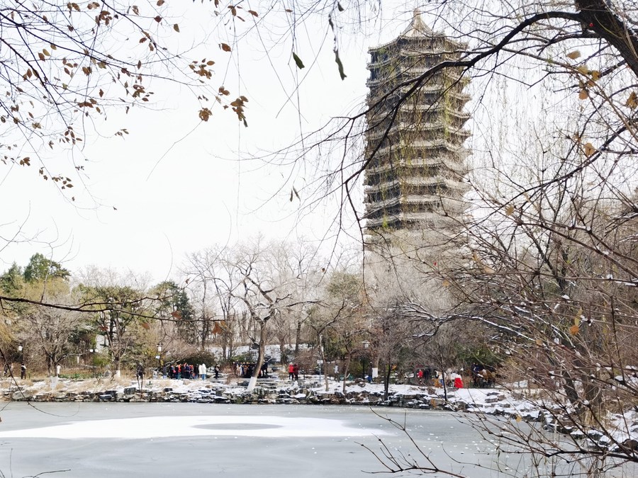 Foto móvel mostra cenário na Universidade de Beijing depois da neve em Beijing, capital da China, 30 de novembro de 2019. (Xinhua/Kong Xiangxin)