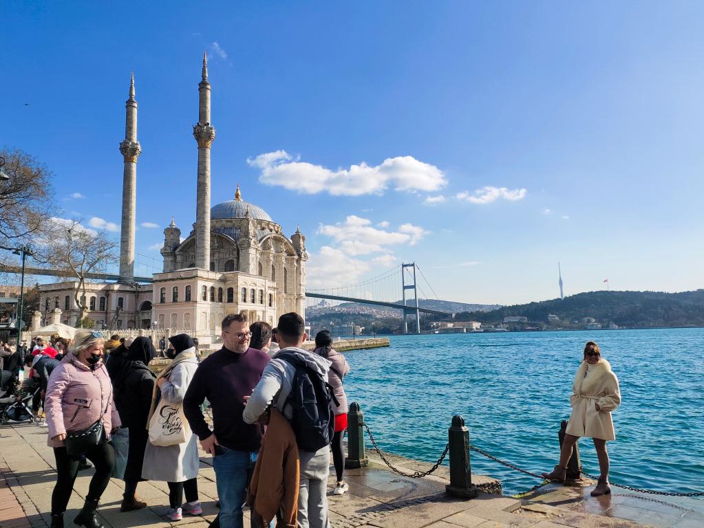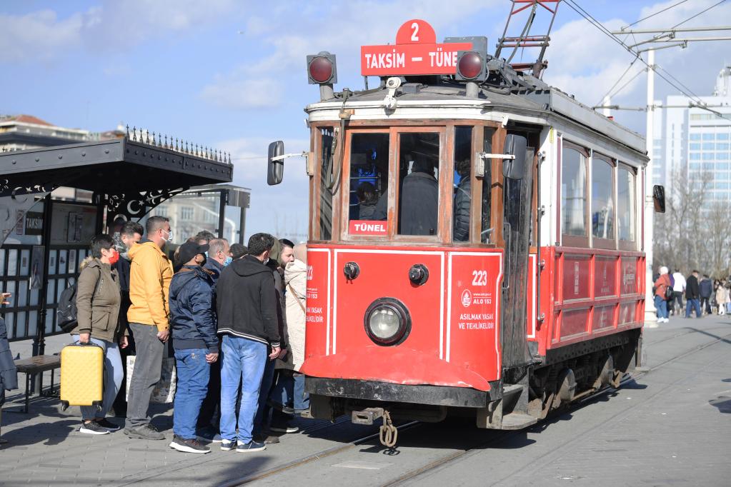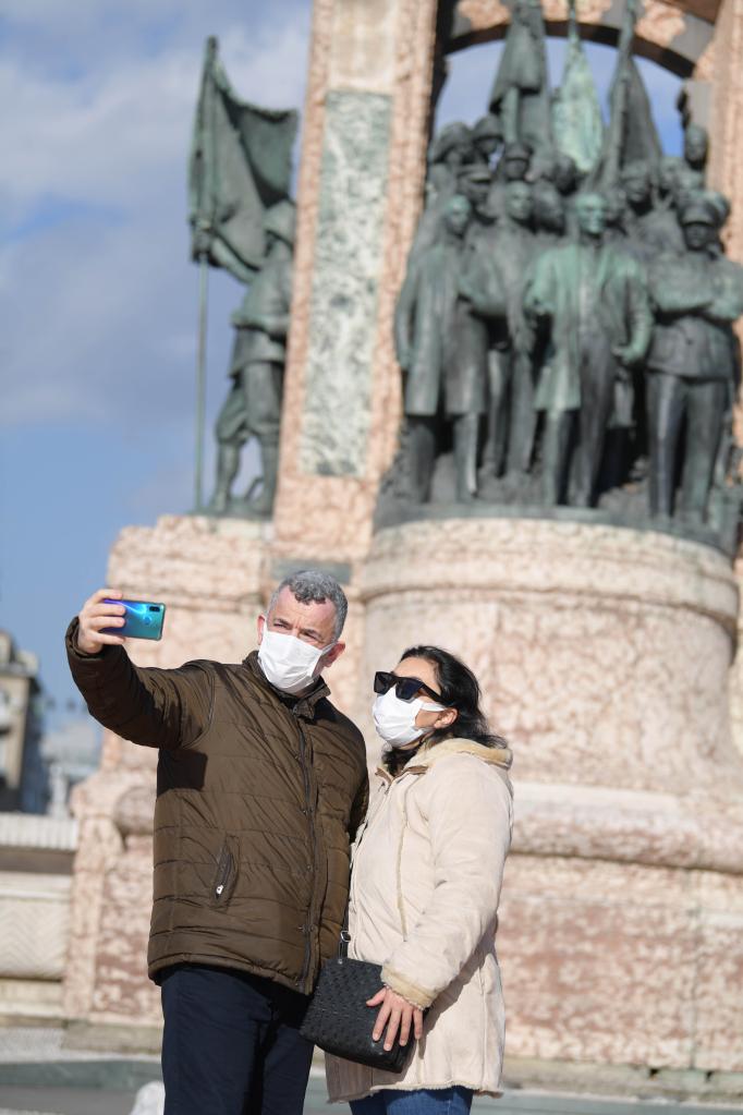 Turistas tiram selfies na Praça Taksim, em Istambul, Turquia, no dia 31 de janeiro de 2022. A receita de turismo da Turquia aumentou 103 por cento em relação ao ano anterior em 2021 e atingiu 24,48 bilhões de dólares americanos, apesar dos contratempos, informou o Instituto de Estatística da Turquia nesta segunda-feira. (Xinhua/Shadati)