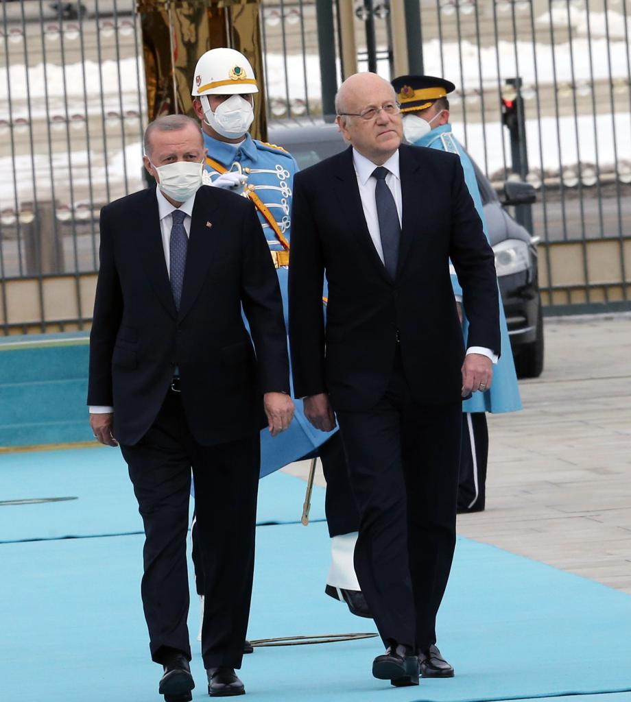 O presidente turco, Recep Tayyip Erdogan (À direita), cumprimenta o primeiro-ministro libanês, Najib Mikati, durante uma conferência de imprensa conjunta em Ancara, Turquia, no dia 1 de fevereiro de 2022. O presidente turco, Recep Tayyip Erdogan, disse na terça-feira que seu país pretende fortalecer a cooperação e a solidariedade com o Líbano em uma ampla gama de campos. Os comentários de Erdogan vieram em uma conferência de imprensa conjunta com o primeiro-ministro libanês, Najib Mikati, em Ancara. (Foto por Mustafa Kaya/Xinhua)