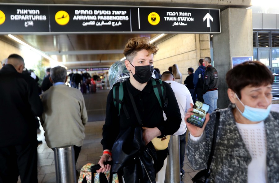 Passageiros caminham com suas bagagens ao chegarem ao Aeroporto Ben Gurion de Israel em Tel Aviv, no dia 13 de fevereiro de 2022. (Foto por Gil Cohen Magen/Xinhua)