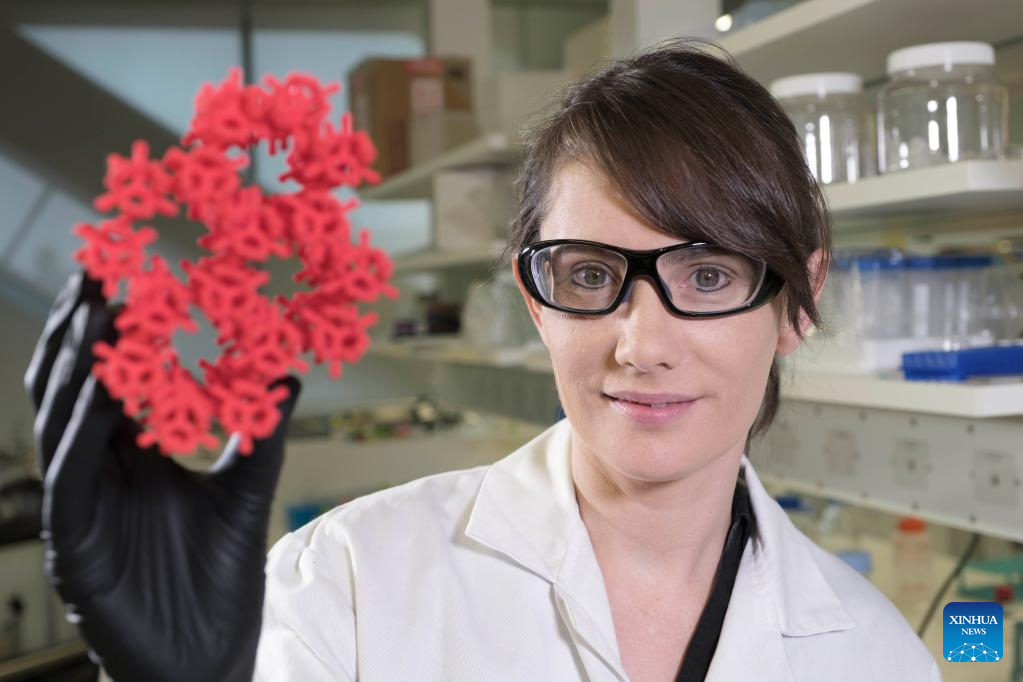 Foto fornecida pela Commonwealth Scientific and Industrial Research Organization (CSIRO) da Austrália no dia 22 de fevereiro de 2022 mostra a cientista sênior do CSIRO, Cara Doherty, exibindo um modelo do material de estruturas orgânicas metálicas (MOFs). Pesquisadores da agência nacional de ciências da Austrália desenvolveram uma tecnologia que pode eliminar a necessidade de refrigerar vacinas. (Nick Pitsas/CSIRO/Divulgação via Xinhua)