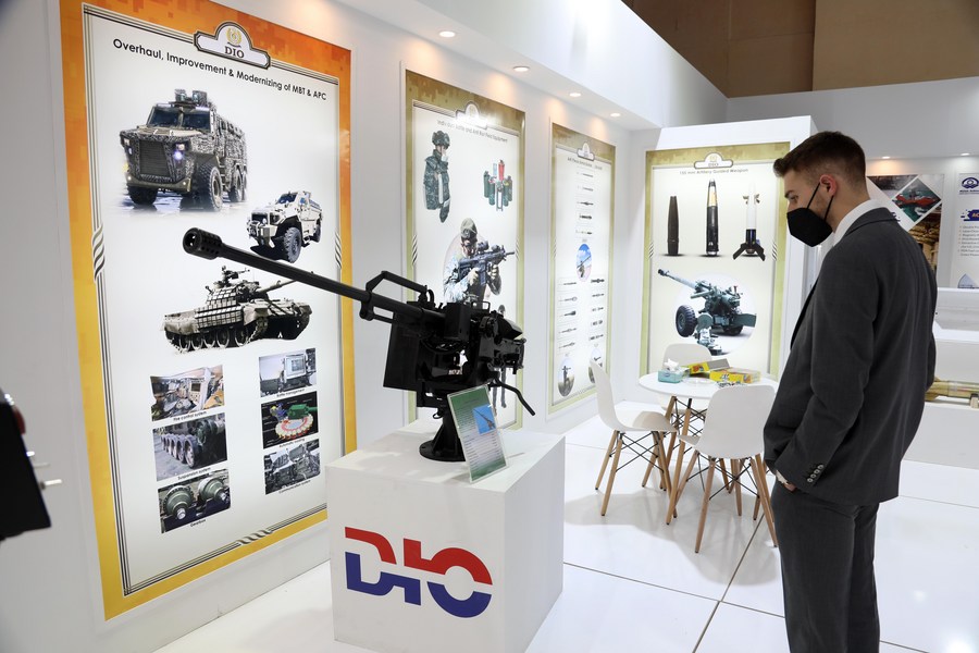 Visitante observa equipamentos militares exibidos na Exposição de Segurança e Defesa em Bagdá, Iraque, no dia 2 de março de 2022. (Xinhua/Khalil Dawood)