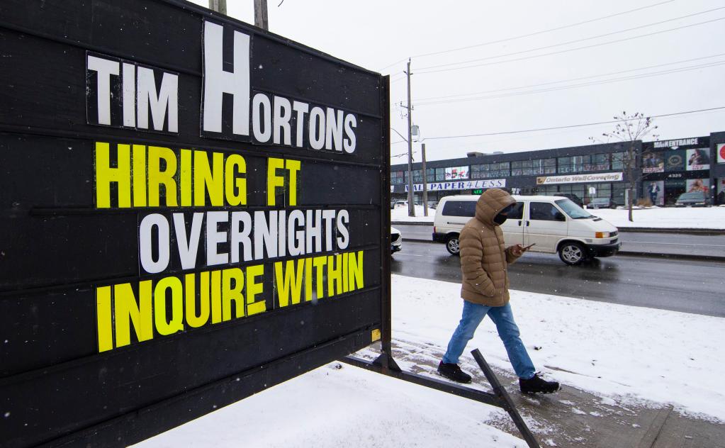 Homem passa por um quadro de empregos do lado de fora de uma loja em Toronto, Ontário, Canadá, no dia 11 de março de 2022. (Foto por Zou Zheng/Xinhua)
