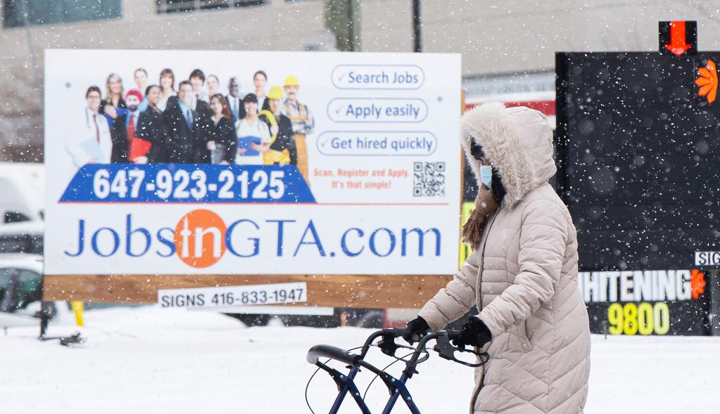 Mulher passa por um quadro de empregos em uma rua em Toronto, Ontário, Canadá, no dia 11 de março de 2022. (Foto por Zou Zheng/Xinhua)