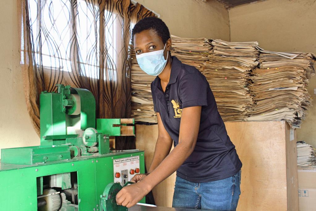 Usando máquinas também enviadas da China, Kealotswe e sua equipe primeiro cortaram os jornais no tamanho do grafite e, em seguida, usaram cola de papel para prender o grafite à fatia de corte do jornal. Depois disso, uma máquina enrola o resto do papel para fazer varetas de lápis presas por cola de resina.