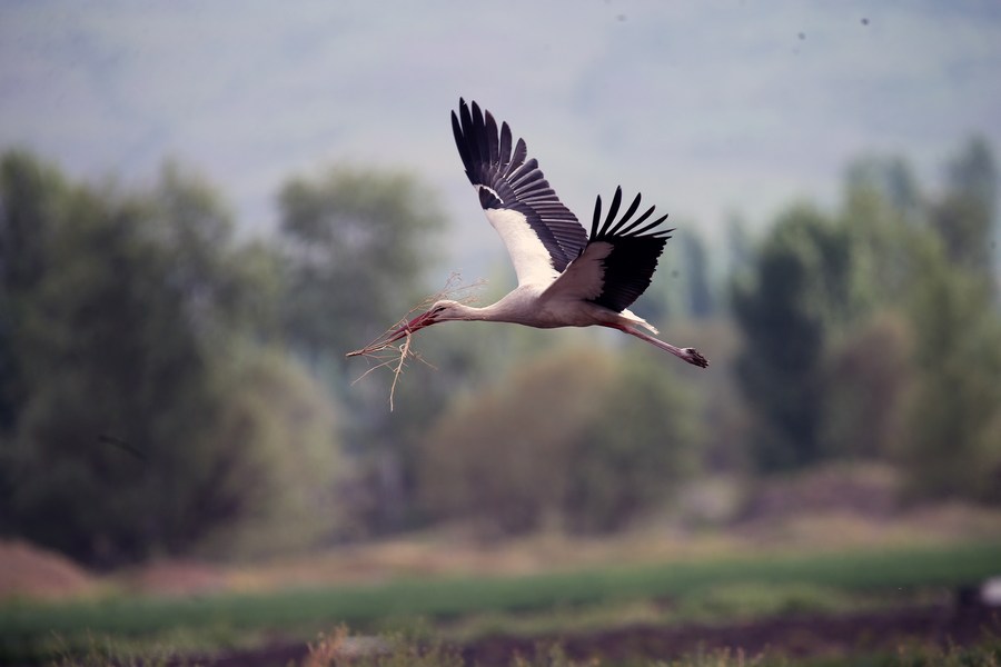 Foto tirada no dia 12 de maio de 2021 mostra uma cegonha no Santuário de Pássaros Nallihan em Ancara, Turquia. (Foto por Mustafa Kaya/Xinhua)