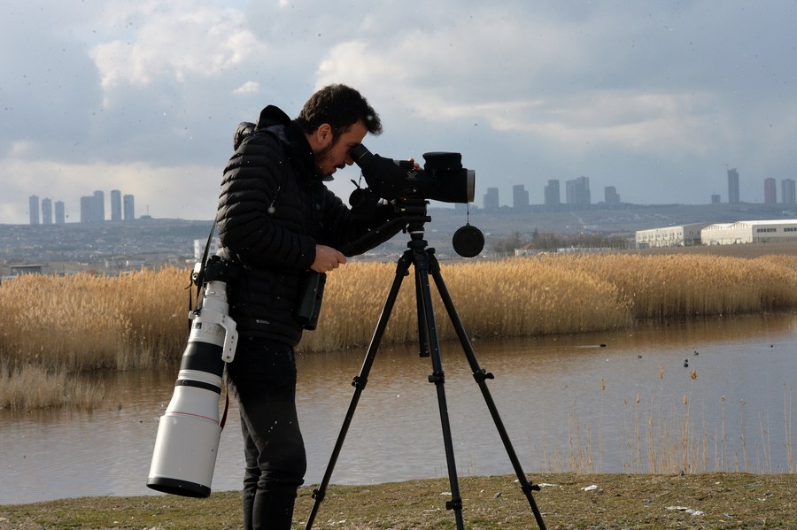 Emin Yogurtcuoglu observa pássaros no Lago Mogan em Ancara, Turquia, no dia 18 de março de 2022. (Foto por Mustafa Kaya/Xinhua)