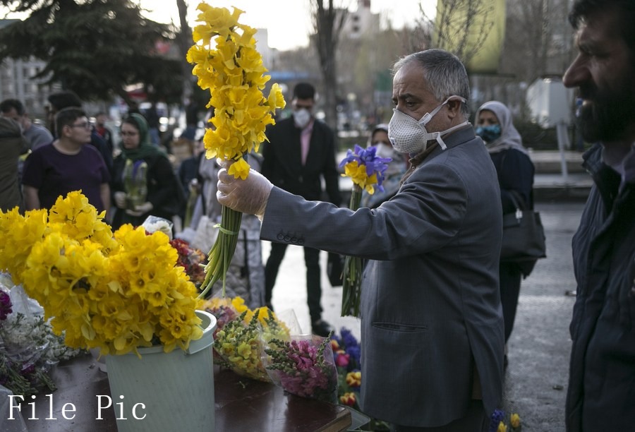 Homem usando uma máscara facial seleciona flores em um bazar em Teerã, Irã, no dia 19 de março de 2020, antes do Noruz ou do Ano Novo iraniano. (Foto por Ahmad Halabisaz/Xinhua)