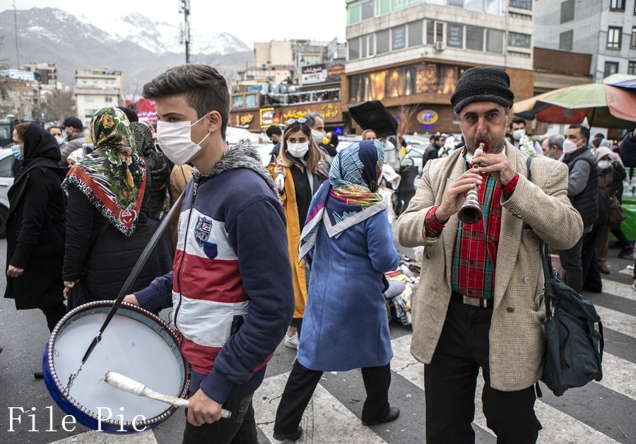 Pessoas tocam instrumentos musicais tradicionais em um bazar antes do Noruz, o Ano Novo iraniano, em Teerã, Irã, no dia 18 de março de 2021. (Foto por Ahmad Halabisaz/Xinhua)
