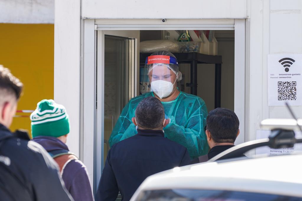 Profissional de saúde coleta amostra com cotonete de um homem em uma estação de teste de COVID-19 em Berlim, capital da Alemanha, no dia 24 de março de 2022. (Foto por Stefan Zeitz/Xinhua)