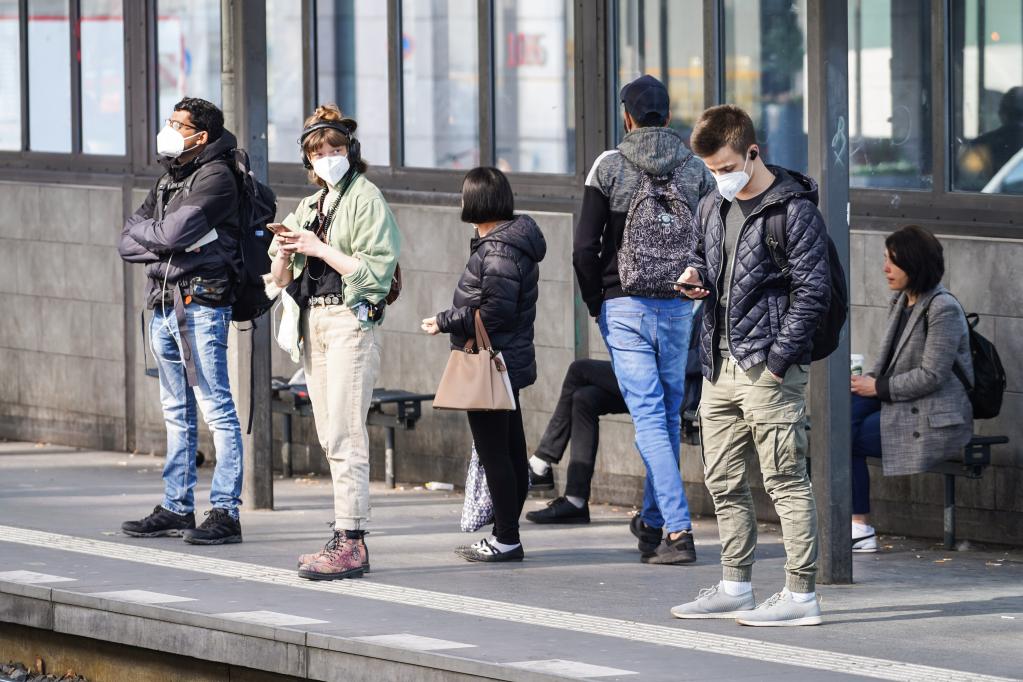 Pessoas usando máscaras aguardam trem em uma estação em Berlim, capital da Alemanha, no dia 24 de março de 2022. (Foto por Stefan Zeitz/Xinhua)
