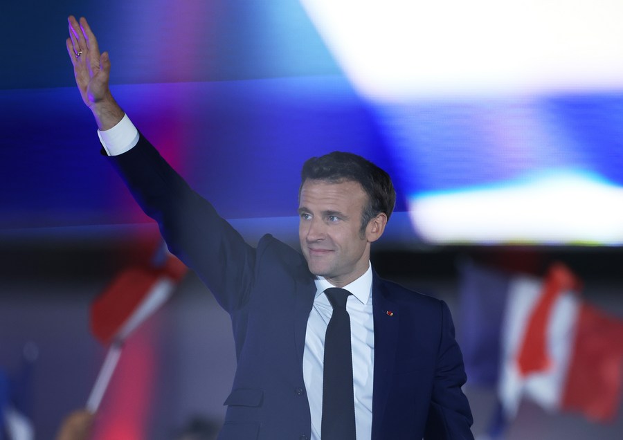 O atual presidente francês, Emmanuel Macron, acena para apoiadores em um comício após o segundo turno presidencial em Paris, França, em 24 de abril de 2022. (Xinhua/Gao Jing)