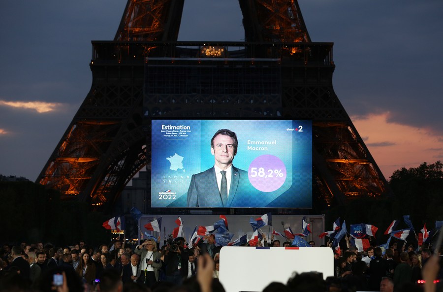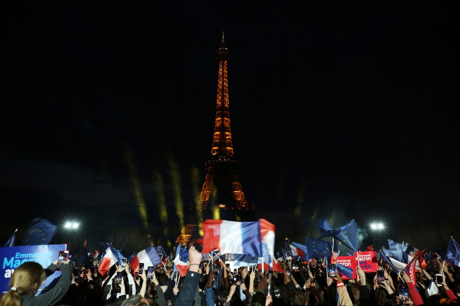 Foto tirada em 24 de abril de 2022 mostra a cena do comício do presidente francês, Emmanuel Macron, após o segundo turno presidencial em Paris, França. (Xinhua/Gao Jing)