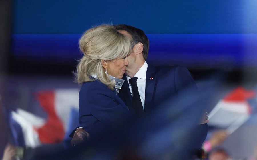 O presidente francês, Emmanuel Macron, beija sua esposa Brigitte Macron em um comício após o segundo turno presidencial em Paris, França, no dia 24 de abril de 2022. (Xinhua/Gao Jing)
