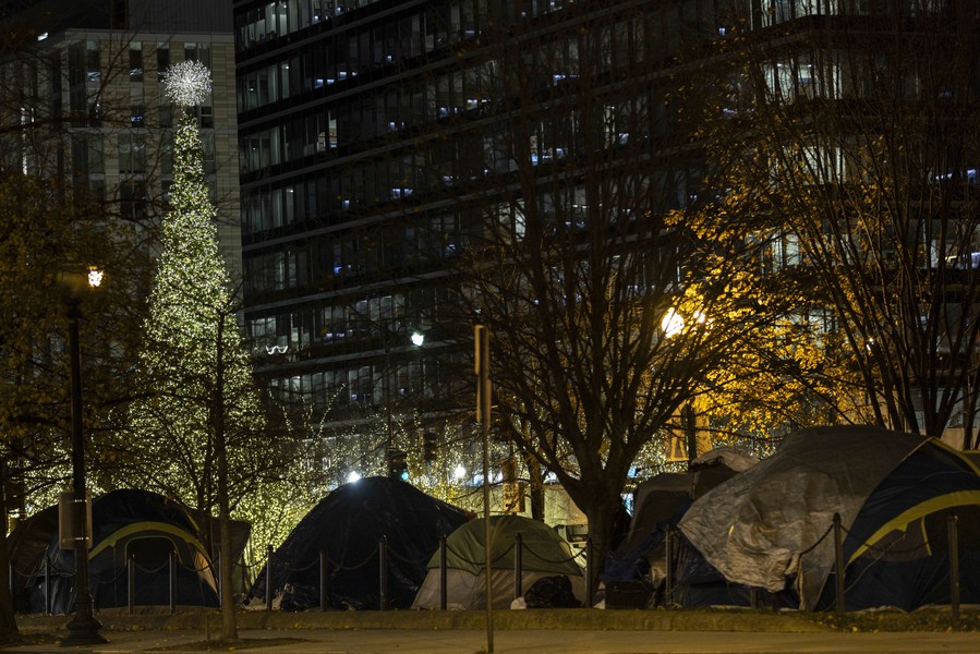Barracas de pessoas em situação de rua são vistas em Washington, D.C., Estados Unidos, no dia 8 de dezembro de 2021. (Xinhua)