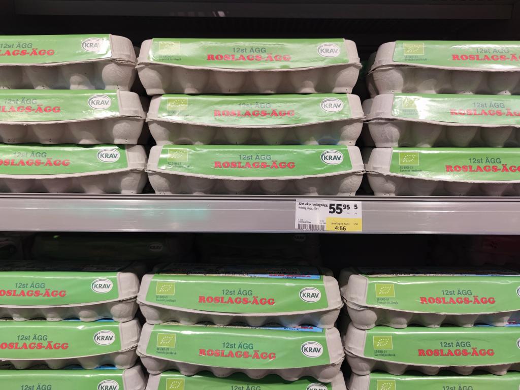 Se um ovo médio custa 2,5 coroas suecas (0,25 dólares americanos), 0,80 coroa é o custo para os agricultores. Mas hoje, toda essa coroa de 0,80 é usada para comprar ração, explicou Denneberg.
