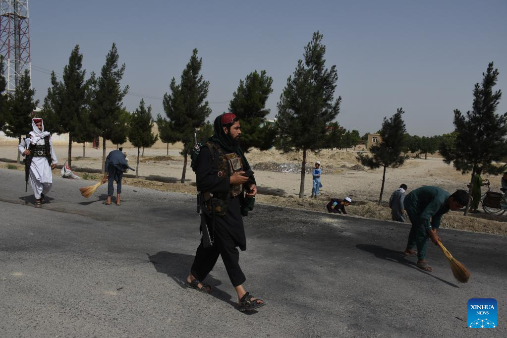 Membros das forças de segurança afegãs montam guarda no local de uma explosão em Mazar-i-sharif, Afeganistão, no dia 19 de maio de 2022. (Foto por Kawa Bashart/Xinhua)
