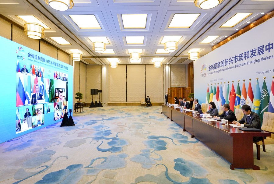 O conselheiro de Estado e ministro das Relações Exteriores da China, Wang Yi, preside via videoconferência um diálogo dos ministros das Relações Exteriores entre países do BRICS e economias de mercados emergentes e países em desenvolvimento, em Beijing, capital da China, em 19 de maio de 2022. (Xinhua/Gao Jie)