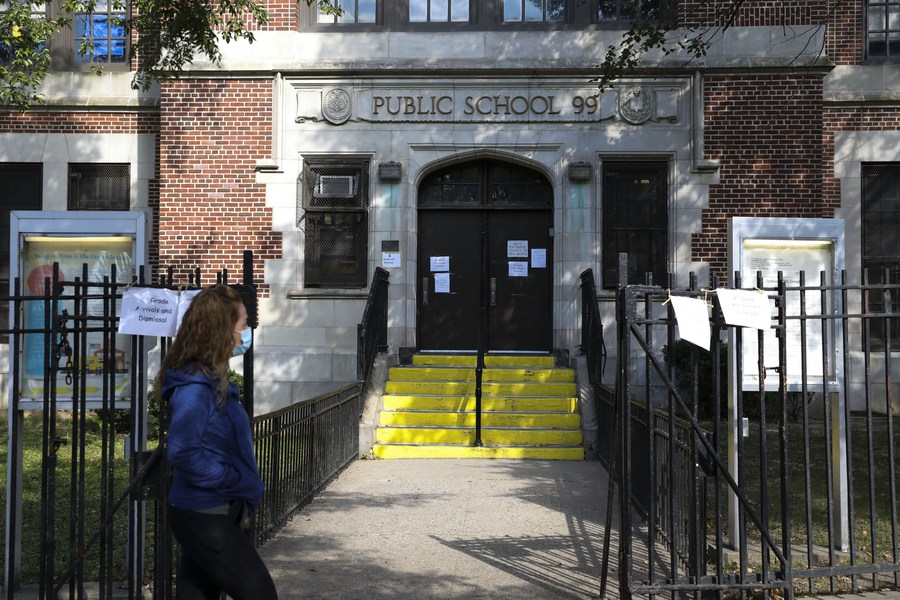 Pedestre passa por uma escola pública em Kew Gardens, uma das áreas de foco de COVID-19 na cidade de Nova York, Estados Unidos, no dia 6 de outubro de 2020. (Xinhua/Wang Ying)