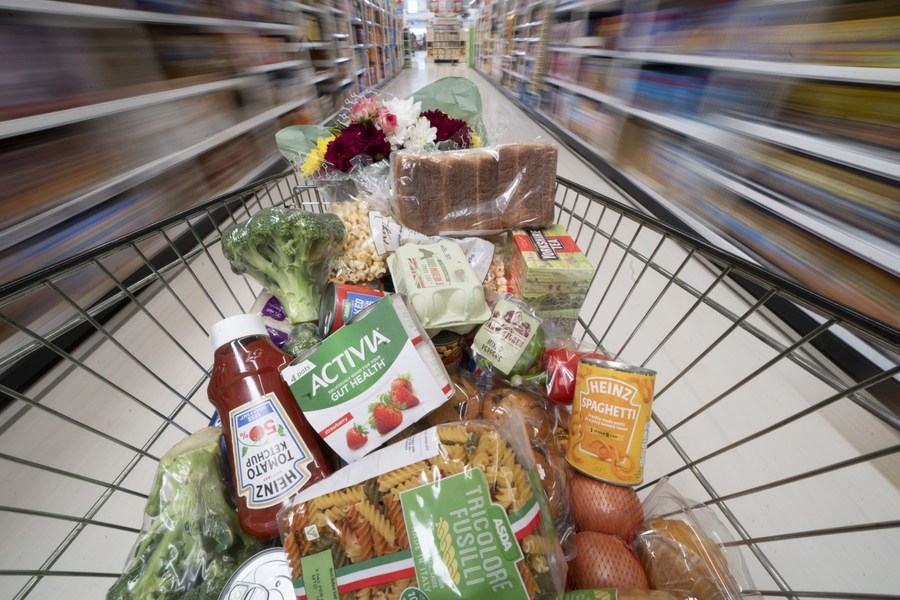Um carrinho de supermercado é visto em Manchester, Grã-Bretanha, no dia 13 de abril de 2022. (Foto por Jon Super/Xinhua)