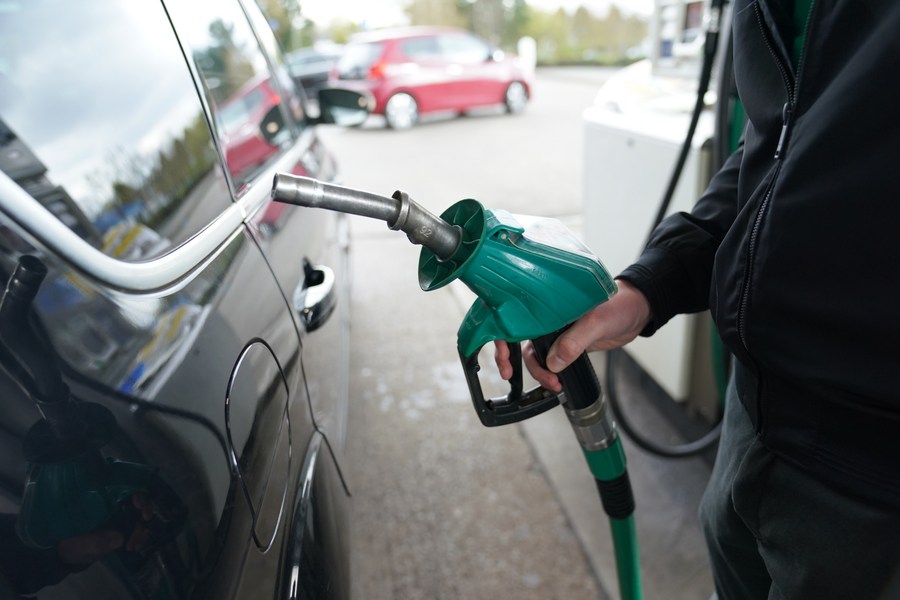 Homem abastece um veículo em um posto de gasolina em Manchester, Grã-Bretanha, no dia 13 de abril de 2022. (Foto por Jon Super/Xinhua)