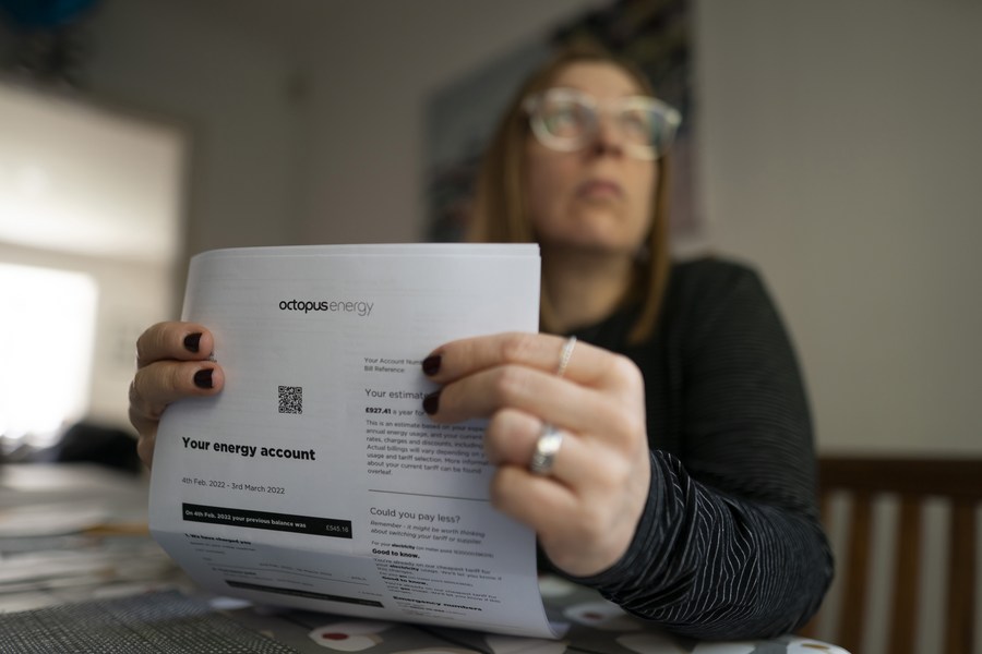 Mulher mostra uma conta de energia em Huyton, Grã-Bretanha, no dia 18 de março de 2022. (Foto por Jon Super/Xinhua)