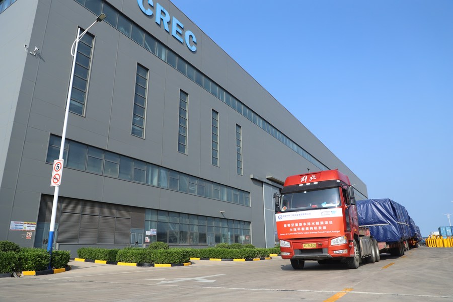 Uma perfuradora de túnel de equilíbrio de pressão de terra (TBM, sigla em inglês) desenvolvida e produzida na China foi transportada em 15 de junho de 2022 no porto de Tianjin, no norte do país, para Lisboa, capital de Portugal. (Foto oferecida pela CREG)