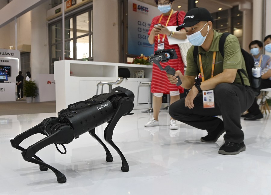Cachorro robô inteligente durante uma exposição sobre a Nova Revolução Industrial do BRICS realizada em Xiamen, Província de Fujian, no leste da China, em 8 de setembro de 2021. (Xinhua/Lin Shanchuan)