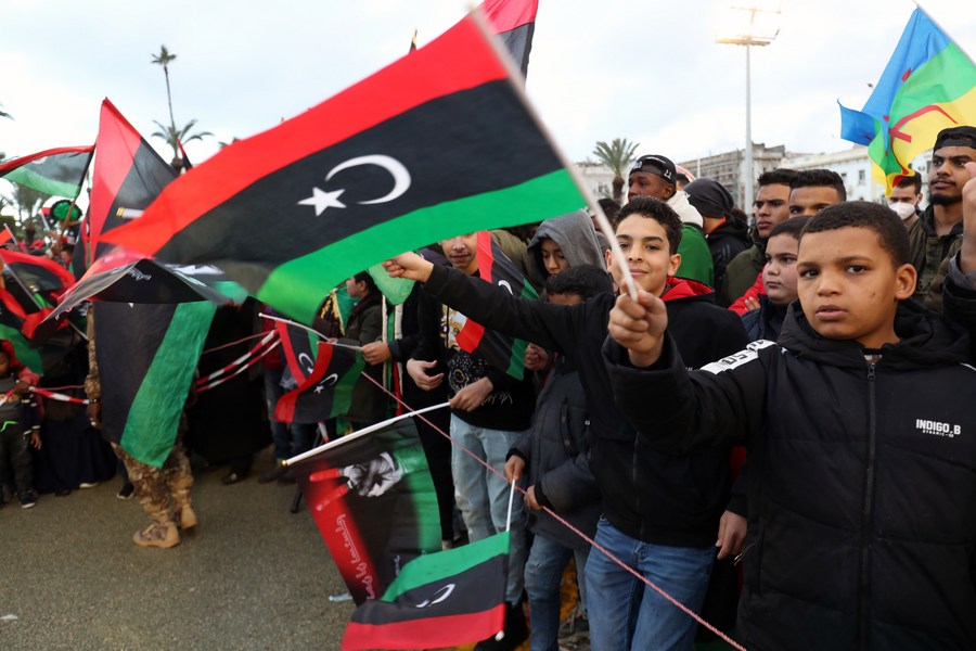 Pessoas se reúnem em um evento que marca o 11º aniversário do levante líbio em Trípoli, Líbia, no dia 17 de fevereiro de 2022. (Foto por Hamza Turkia/Xinhua)