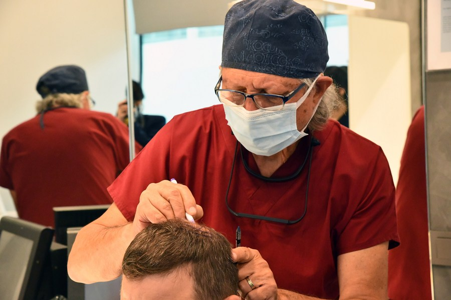 Médico turco transplanta folículos capilares em seu paciente em Bursa, Turquia, no dia 11 de agosto de 2022. (Foto por Mustafa Kaya/Xinhua)