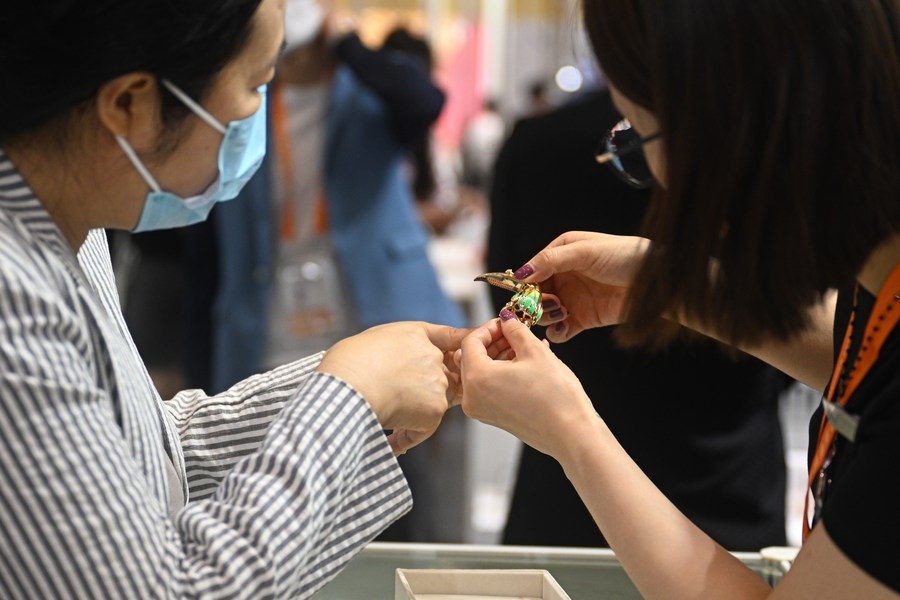 Uma funcionária (à direita) apresenta uma peça de joalheria italiana no pavilhão da Itália na 3ª Exposição Internacional de Produtos de Consumo da China (CICPE, em inglês) em Haikou, capital da província de Hainan, no sul da China, em 11 de abril de 2023. (Xinhua/Pu Xiaoxu)