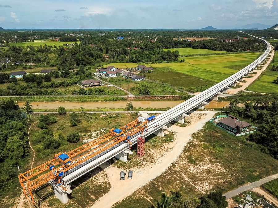 Foto aérea tirada no dia 26 de abril de 2023 mostra canteiro de obras do East Coast Rail Link (ECRL), um grande projeto de infraestrutura da Iniciativa do Cinturão e Rota em Kelantan, Malásia. (Xinhua/Zhu Wei)