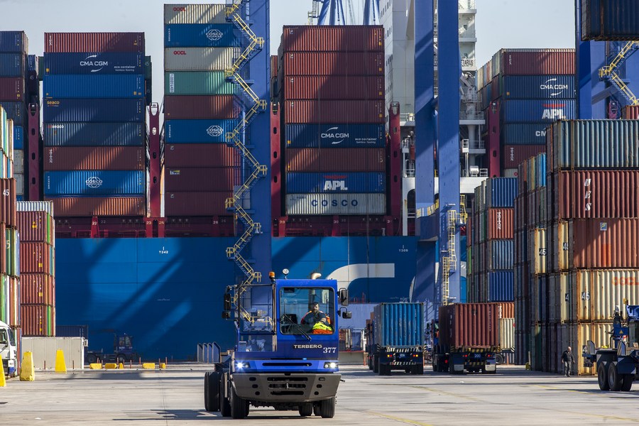 Um operador trabalha no terminal de contêineres III no porto de Pireu, Grécia, no dia 16 de fevereiro de 2023. (Xinhua/Marios Lolos)