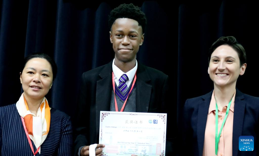 Jayeola Adenuga (centro), estudante do 10º ano da Escola de Ensino Secundário Becket Keys Church of England em Essex, mostra certificação de primeiro lugar da "Apresentação Individual da 3ª Fase Principal" na Competição de Língua Mandarim "Ponte Chinesa" de 2023 para escolas do Reino Unido e a Apresentação Primária de Chinês em cerimônia de premiação da competição em Londres, Grã-Bretanha, no dia 21 de setembro de 2023. (Xinhua/Li Ying)