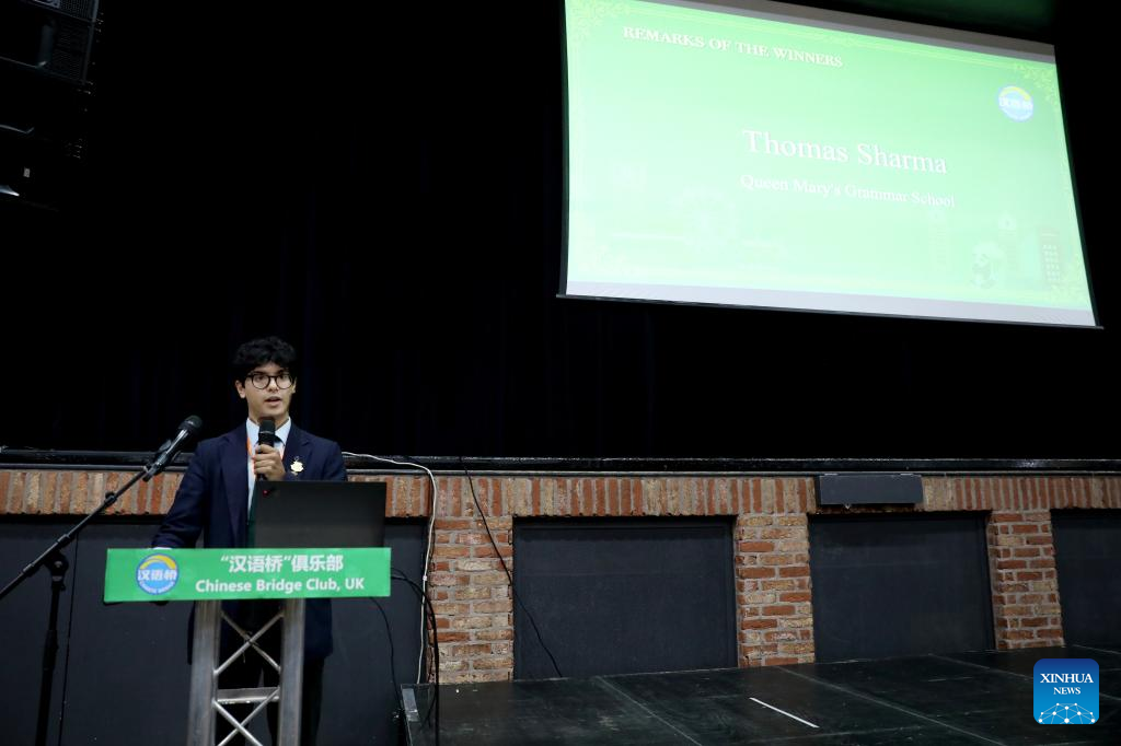 Thomas Sharma, vencedor do prêmio de primeiro lugar de nível avançado de habilidade linguística individual da Final Regional do Reino Unido da Competição de Língua Mandarim "Ponte Chinesa" de 2023 para Escolas do Reino Unido e a Apresentação Primária de Chinês, fala em cerimônia de entrega de prêmios da competição em Londres, Grã-Bretanha, no dia 21 de setembro de 2023. (Xinhua/Li Ying)