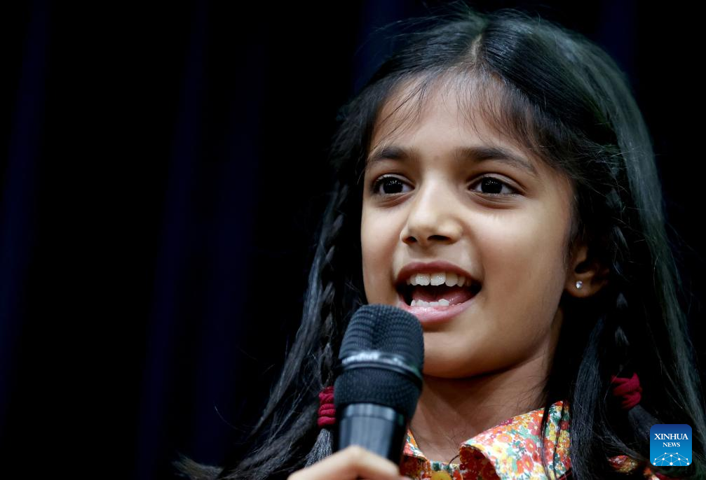 Myrah Kumar, estudante da Escola Kensington Wade, canta música chinesa na cerimônia de entrega de prêmios da Competição de Língua Mandarim "Ponte Chinesa" de 2023 para escolas do Reino Unido e a Apresentação Primária de Chinês em Londres, Grã-Bretanha, no dia 21 de setembro de 2023. (Xinhua /Li Ying)