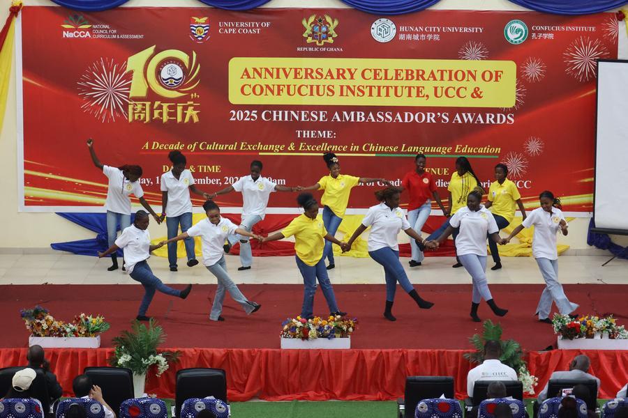 Estudantes se apresentam durante celebração do 10º aniversário do Instituto Confúcio na Universidade de Cape Coast, em Cape Coast, capital da Região Central de Gana, em 15 de dezembro de 2025. (Foto de Seth/Xinhua)