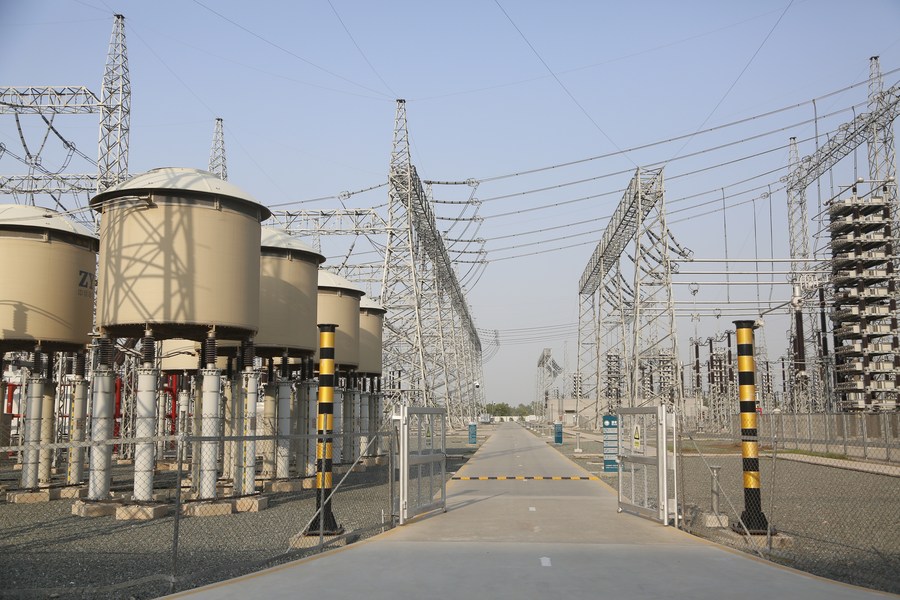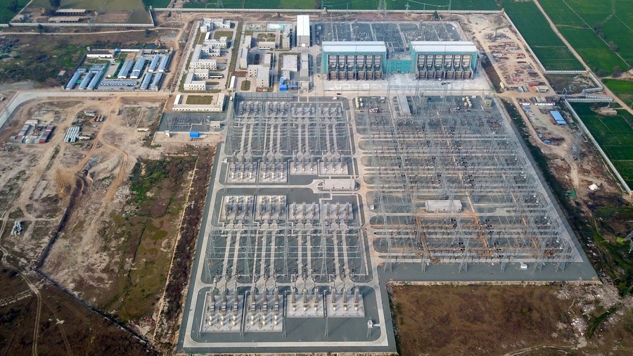 Foto tirada no dia 4 de fevereiro de 2021 mostra estação conversora de Lahore do projeto de transmissão de corrente contínua de alta tensão (HVDC, na sigla em inglês) ±660kV Matiari-Lahore sob o Corredor Econômico China-Paquistão (CECP) na província oriental de Punjab, no Paquistão. (SGCC/Divulgação via Xinhua)
