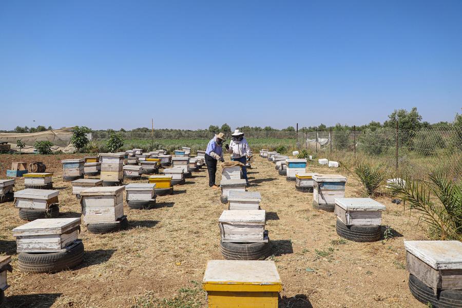 Apicultores palestinos trabalham em uma fazenda de abelhas na cidade de Beit Hanoun, no norte da Faixa de Gaza, no dia 6 de junho de 2022. (Foto por Rizek Abdeljawad/Xinhua)