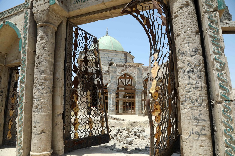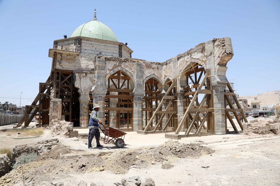 Omer Taqa, engenheiro iraquiano do local de reconstrução, disse à Xinhua que "iniciamos o trabalho de reconstrução da mesquita al-Nuri e seu minarete al-Hadbaa em 2019 e removemos aproximadamente 5.600 toneladas de escombros, além de 11 artefatos explosivos plantados dentro das paredes da mesquita".