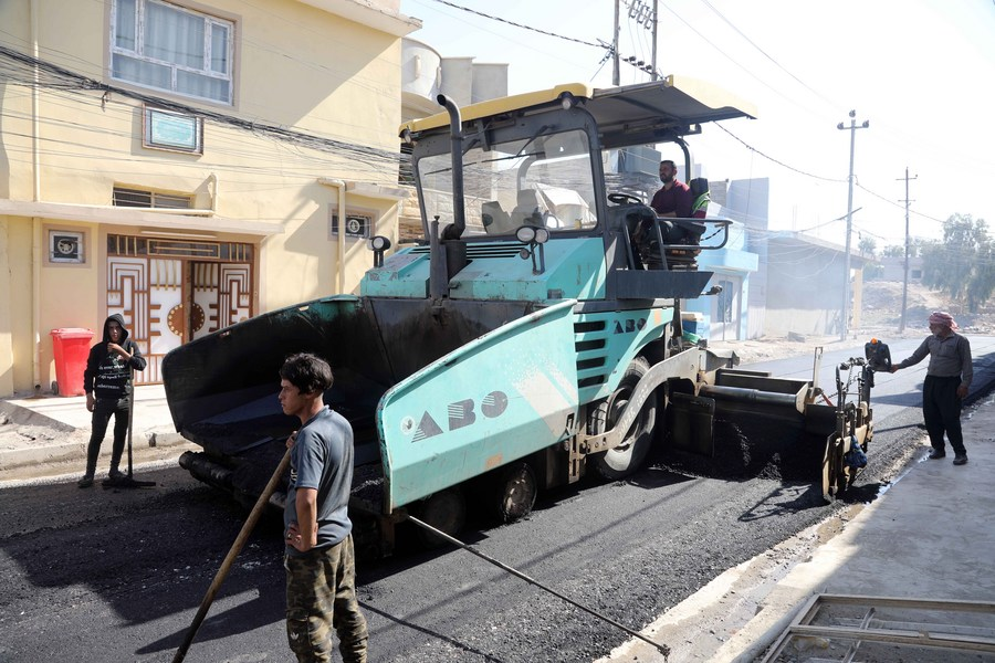 Foto mostra um rolo compressor pavimentando as ruas da cidade velha de Mosul, Iraque, no dia 4 de julho de 2022. (Xinhua/Khalil Dawood)