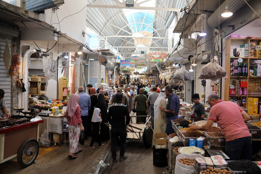 O antigo mercado de Attareen na cidade velha de Mossul cheio de compradores em Mossul, Iraque, no dia 2 de julho de 2022. (Xinhua/Khalil Dawood)