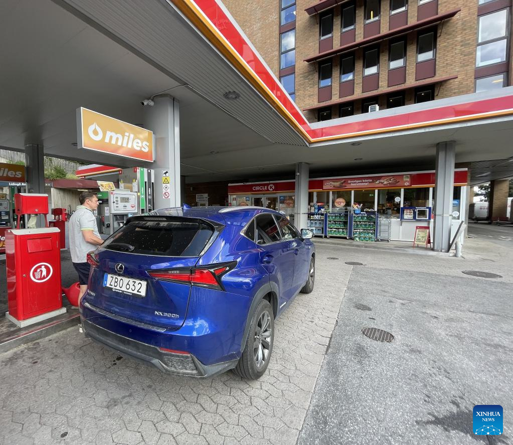 Homem abastece um veículo em um posto de gasolina em Estocolmo, Suécia, no dia 14 de julho de 2022. (Xinhua/Fu Yiming)