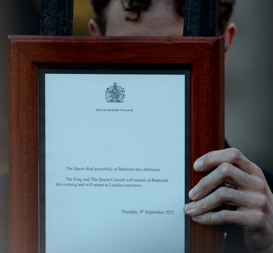Uma nota que anuncia o falecimento da rainha Elizabeth II é colocada no portão do Palácio de Buckingham em Londres, Reino Unido, em 8 de setembro de 2022. (Xinhua/Li Ying)