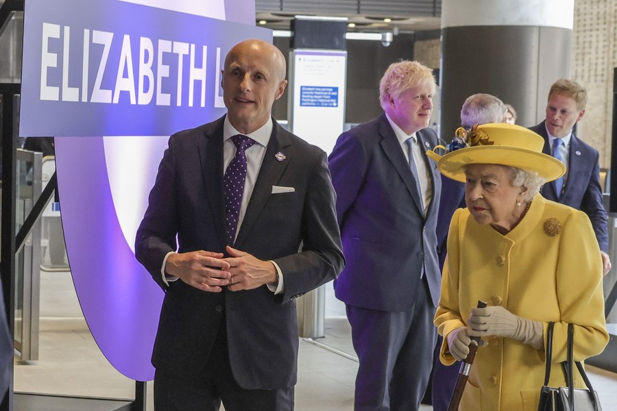A rainha Elizabeth II do Reino Unido (à direita, frente) participa da cerimônia da inauguração da Linha Elizabeth na Estação de Paddington em Londres, em 17 de maio de 2022. (Andrew Parsons/Nº 10 Downing Street/Xinhua)