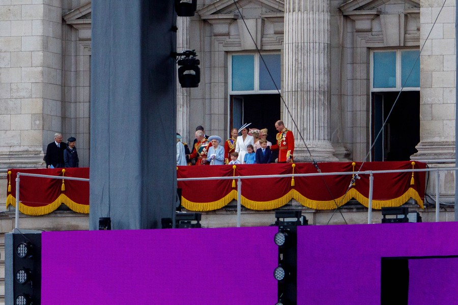 A rainha Elizabeth II do Reino Unido (Centro) é vista na varanda do Palácio de Buckingham depois da parada Trooping the Colour em celebração do seu Jubileu de Platina, em Londres, em 2 de junho de 2022. (Foto por Tim Ireland/Xinhua)