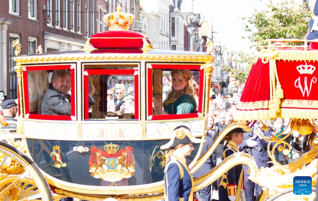 O rei holandês Willem-Alexander e a princesa Amalia acenam para as pessoas no Glass Coach em Haia, nos Países Baixos, no Dia do Príncipe, em 20 de setembro de 2022. A terceira terça-feira de setembro é o Dia do Príncipe nos Países Baixos. Marca a abertura da temporada parlamentar holandesa, e neste dia o monarca reinante descreve os planos do governo para o próximo ano. (Foto por Sylvia Lederer/Xinhua)