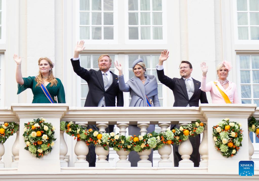A princesa holandesa Amalia, o rei Willem-Alexander, a rainha Maxima, o príncipe Constantijn e a princesa Laurentien (da esquerda para a direita) acenam para pessoas na varanda do Palácio Noordeinde em Haia, Países Baixos, no Dia do Príncipe, no dia 20 de setembro de 2022. A terceira terça-feira de setembro é o Dia do Príncipe nos Países Baixos. Marca a abertura da temporada parlamentar holandesa, e neste dia o monarca reinante descreve os planos do governo para o próximo ano. (Foto por Sylvia Lederer/Xinhua)