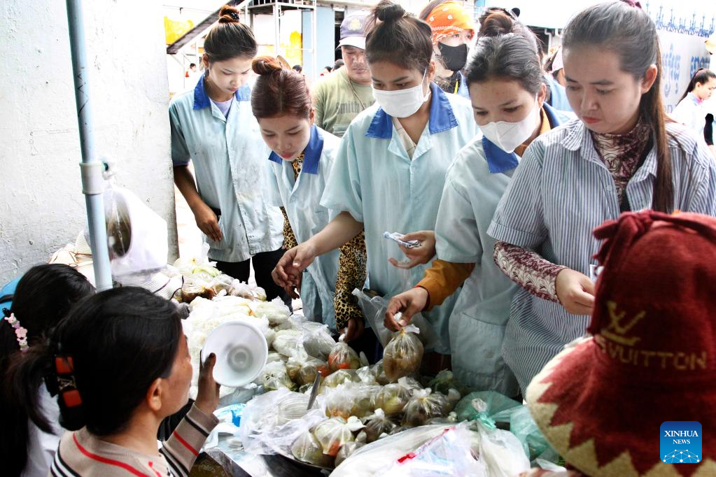 Trabalhadores de fábricas de vestuário compram refeições em Phnom Penh, Camboja, no dia 21 de setembro de 2022. (Foto por Phearum/Xinhua)